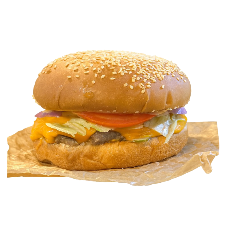 Булочка,сочная говяжья котлета, фирменный соус, фрэш салат, лук, маринованный огурчик, сыр чеддер.